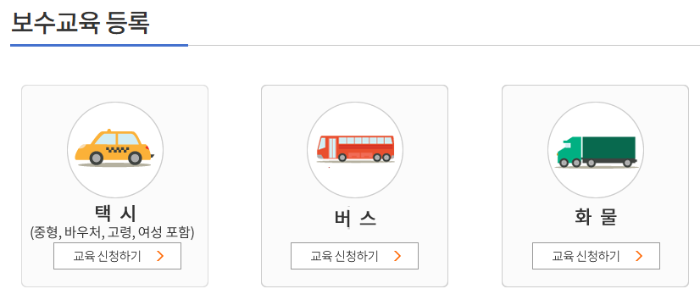 예시로, 아래는 경기도 교통연수원에서 제공하는 화물 보수교육 신청 화면입니다. 해당 연수원은 경기도민뿐만 아니라 타 지역 운전자도 신청이 가능합니다.